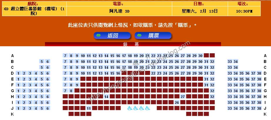 上圖所見,便是位於香港國際機場二號客運大樓內的「4D超立體巨幕影館」,上圖所見,便是年三十播放晚上十時半場的《阿凡達》3D版本,至今已售半逾半戲票。雖然看起來銷情不及其餘兩家IMAX戲院。但試想一下,先要山長水遠入到機場看戲,散場時已是凌晨一時,機鐵也不知尾班車開了沒有的時候,仍有逾百觀眾願意觀看,實在難得。