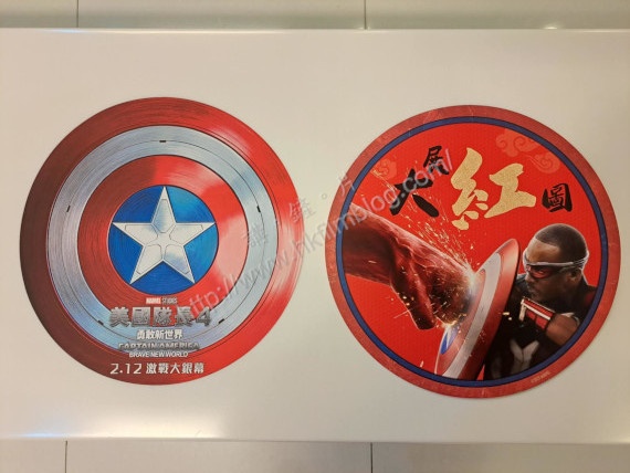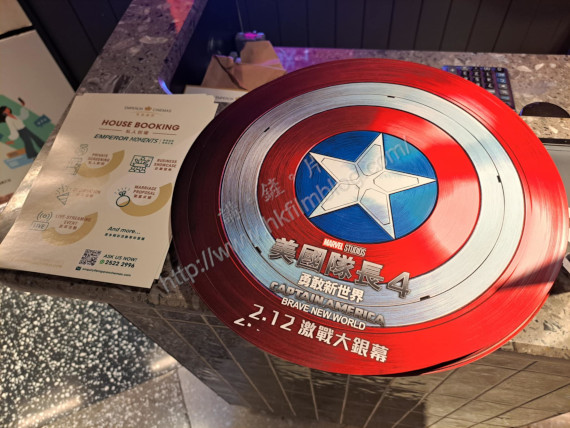 上圖所見,便是「講。鏟。片」情報人員日前於其中一家英皇戲院所攝。可以看到該戲院近票房的位置,擺放了迪士尼發行、將於二月十二日上映的《美國隊長4解敢新世界》電影宣傳品。宣傳品設計成圓形,正好配合了電影裡美國隊長的圓形盾牌的形狀。