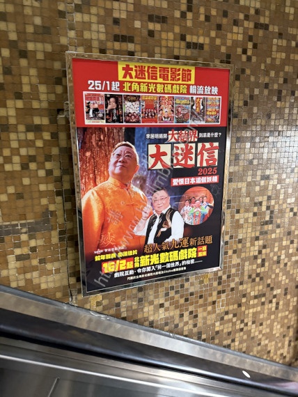 上圖所見,便是「講。鏟。片」情報人員日前於港鐵黃大仙站所攝,可以看到該車站連接大堂與月台的扶手電梯,其中一個廣告位置貼上了電影《大迷信2025之大結界》的宣傳。當中上方先宣傳於一月二十五日起在新光戲碼戲院舉行的「大迷信電影節」,下方則是將於二月十六日於新光數碼戲院一日五場的《大迷信2025之大結界》宣傳。
