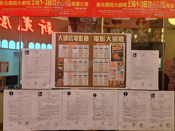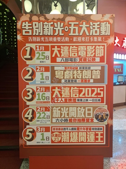 上圖所見,便是「講。鏟。片」情報人員於日前在新光戲院大劇場的大堂所攝,可以看到該戲院推出告別新光五項活動。先有一月廿五日起的《大迷信》電影節,然後就是二月一日起的《粵劇特朗普》,繼而是二月十六日上映的《大迷信2025之大結界》,而二月廿二日早上十時至下午四時還有新光開放日,最後就是三月一日舉行《大迷信3之潮爆開運王》特別選映。