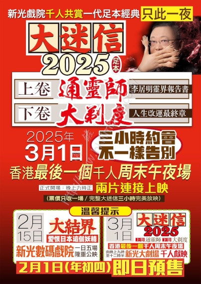 新光戲院大劇場原安排於三月一日晚上十一時,安排放映《大迷信3之潮爆開運王》。如今將其開時間改為晚上九時正,並且放映《大迷信2025》。然而,所謂的《大迷信2025》其實由兩部電影組成,分別「上卷」為《通靈師》,而「下卷」則為《大剃度》。