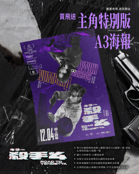 mm2與環球影業香港聯合發行、文佩卿與坂本浩一監製、梁居英執導、梁居英與文佩卿編劇,魏浚笙與南沙良主演的《殺手#4》原安排於今天開畫。然而隨著發行改動,電影改為今天與明天推出優先場,正式公映日期調整至十二月六日。近期不少港片為求吸引觀眾入場,也會為購票觀眾提供禮品,而《殺手#4》亦不例外。