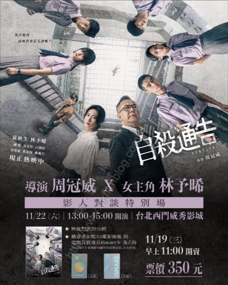 周冠威執導,以校園自殺為題材《自殺通告》在香港送檢三個多月仍未獲得送檢結果,而台灣則已於十一月七日在港上映。而製作團隊為電影仍算是盡力。而就在上映的第三個周末,將會提「影人對談特別場」。