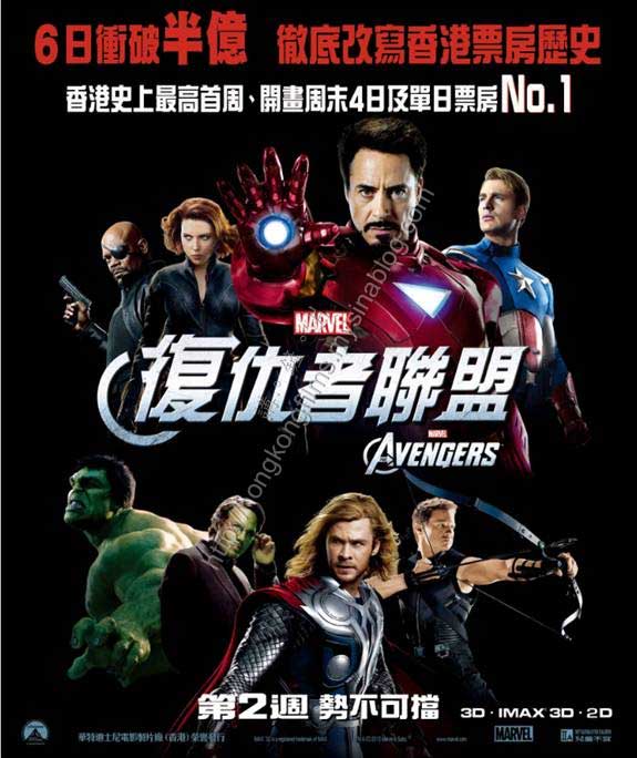 迪士尼發行的《復仇者聯盟》在勞動節後踏進平日,票房較過去六天出現較明顯的跌幅,而昨天於124院映574場,雖然仍收244萬並佔了全日票房逾三分之二,不過票房已較上周四下跌五成七,而每場人次亦跌回40水平,反映了電影的熱潮隨假期結束有所降溫,然而電影已於八天累積達5,627萬,倘若周末票房能爬升逾倍,仍有望於周日累積達至七千萬。